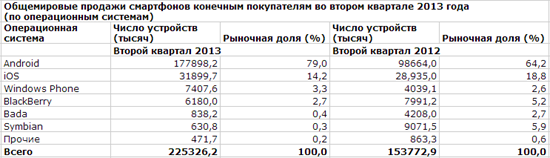 Самой популярной операционной системой для смартфонов является Android — она установлена на 79% проданных во втором квартале этого года устройств. Ее рост в сравнении с аналогичным периодом прошлого года составил 19%.