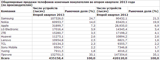 Верхние позиции в списке производителей телефонов заняло несколько китайских компаний, среди них ZTE, Huawei, Lenovo, TCL и Yulong. На пятерых они поделили 12,7% общемирового рынка телефонов.