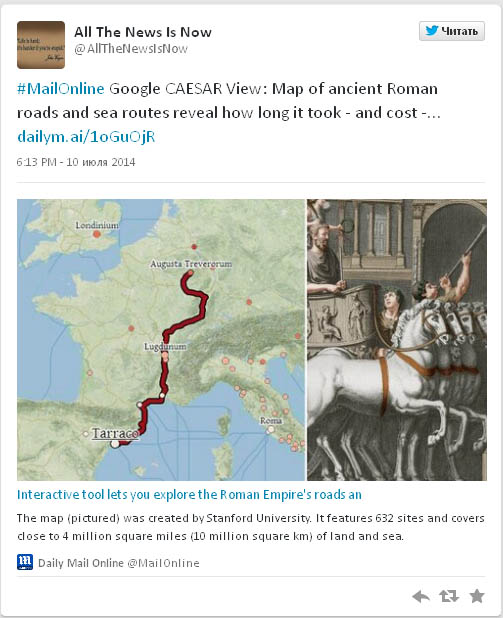 Историк из Стэнфордского университета Уолтер Шейдел создал подробную интерактивную карту Римской империи. На ней отображено 632 пункта, расположенных в материковой Европе, Великобритании и Африке. Карта позволяет оценить географию великой империи и понять, сколько времени заняло бы путешествие по тому или иному маршруту в 200 году нашей эры.