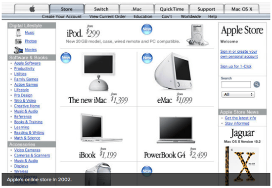 По воспоминаниям Эдди Кью и разработчика Джо Морено, в 1997 году сайты электронной коммерции в массе своей выглядели непривлекательно и запутанно. Apple всего за 10 лет сумела вывести онлайн-ритейл на новый уровень, открыв в дополнение к своему интернет-магазину еще 100 оффлайн-магазинов по всему миру (и одной из первых связав онлайн-заказ и оффлайн-продажи).