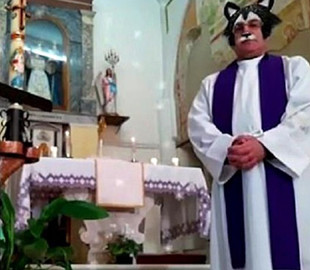 Во время прямой трансляции в соцсети падре стоит у креста в церковном облачении. Неожиданно он предстает перед зрителями в необычном образе.