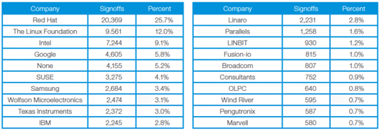 Компании Google и Samsung стали крупными поставщиками кодов для Linux, теперь обе эти компании входят в десятку крупнейших доноров кода для открытой операционной системы, работающей на серверах, десктопах и мобильных устройствах. В новом отчете Linux Kernel Development, опубликованном Linux Foundation, Samsung и Google называются седьмым и восьмым крупнейшим поставщиками кода для ядра ОС. Их обгоняют компании Red Hat Intel, Texas Instruments, Linaro, Suse и IBM. В отчете говорится, что всего с марта 2012 года в ядро Linux было внесено около 92 000 дополнений или изменений от 3738 поставщиков.