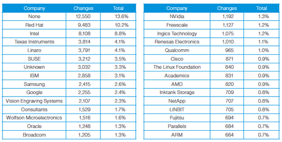 None в рейтинге - это разработчики, работающие по их собственному корпоративному спонсорству, а Unknown - это поставщики, происхождение которые было доподлинно неизвестно, а также частные консультанты. Авторы рейтинга говорят, что компания Linaro, выпускающая программное обеспечение для ARM-систем, сделала гигантский скачок с 0,7% до 4,1% кода за года. В Linux Foundation говорят, что Linaro, Samsung, Texas Instruments сумме увеличили свою долю с 4,4% изменений до 11%. Все эти компании активно ведут разработки ARM-решений для Linux и работают на рынке встраиваемых систем.