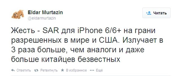 Накануне ведущий аналитик Mobile Research Group Эльдар Муртазин поделился собственными наблюдениями, согласно которым излучение от iPhone 6 и iPhone 6 Plus в разы выше, чем от смартфонов других производителей. Аналитик напрямую заявил, что использование новинок Apple небезопасно.
