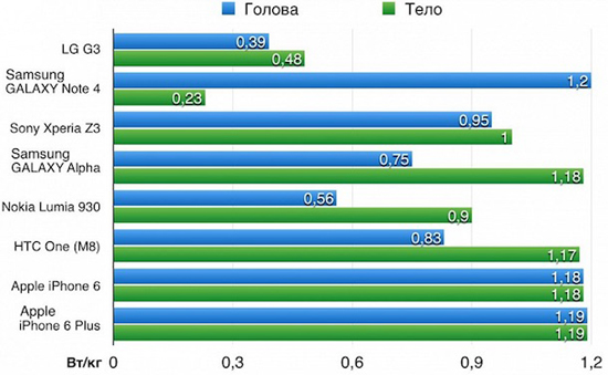 Данные SAR (уровня удельного коэффициента поглощения электромагнитной энергии), согласно данным hi-tech.mail.ru: