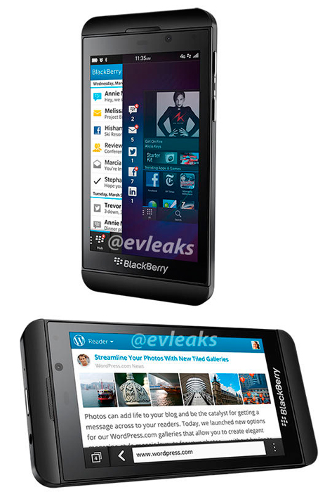 Микроблог @evleaks опубликовал изображения BlackBerry Z10, анонс которого ожидается в среду, 30 января 2013 г. Ранее в интернете уже размещались изображения нового аппарата, а также сравнительный обзор с Apple iPhone 5.