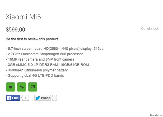 Благодаря интернет-магазину Oppomart известно, что Mi5 получит 5,7-дюймовый дисплей разрешением 2560 х 1440 точек, а также Android 5.0 “из коробки” с прошивкой MIUI 6.