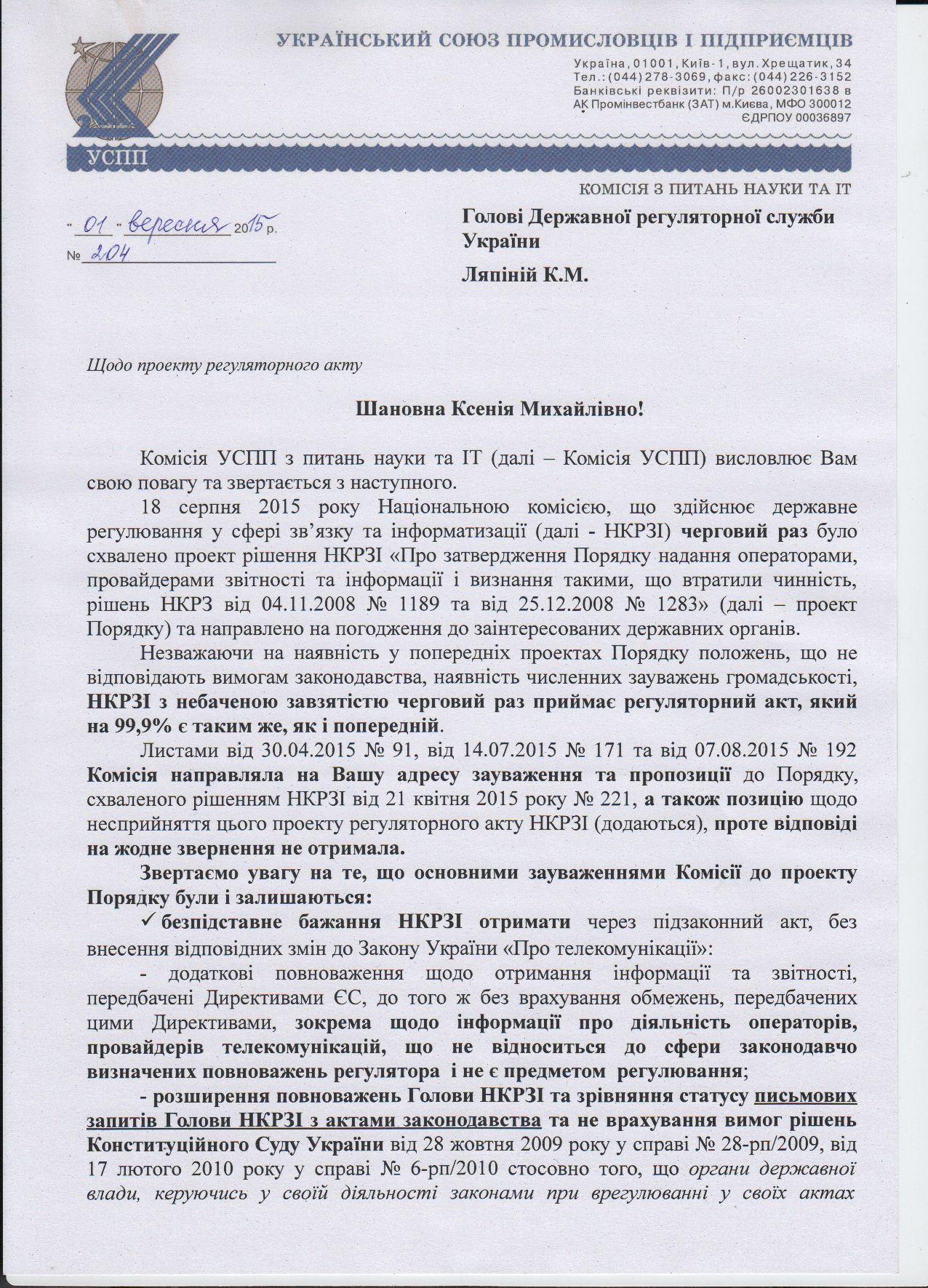 Национальная комиссия, осуществляющая государственное регулирование в сфере связи и информатизации (НКРСИ) рассылает членам ИнАУ "письма счастья", в которых просит предоставить информацию о финансово-экономических показателях за 2015-й год.