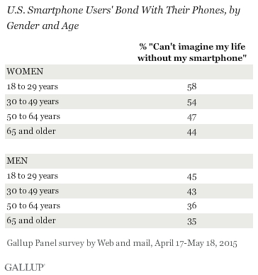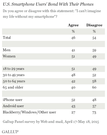 Исследовательское агентство Gallup опубликовало результаты опроса американских потребителей, которым задавали вопрос: «Вы согласны с тем, что не представляете свою жизнь без смартфона». Выбрать можно было один из двух вариантов ответа – «Согласен» или «Не согласен». Оказалось, что не могут жить без телефона около половины респондентов. При этом больше всех от смартфонной зависимости страдают владельцы устройств на iOS и Android.