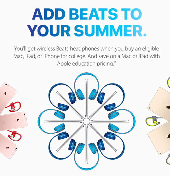 Ежегодно перед началом нового учебного года Apple запускает акцию Back to School, в рамках которой, покупатели Mac, iPad и iPhone получают различные бонусы. В этот раз пользователям предложили беспроводные наушники Beats Solo2 при покупке Mac и Beats Powerbeats2 при покупке iPad Pro, iPhone 6 или iPhone 6s. Сами наушники довольно неплохи и подходят для большинства сценариев.