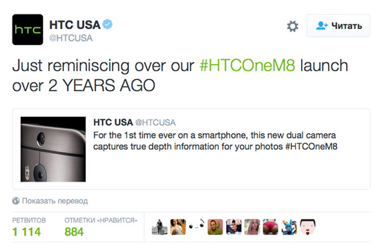 На самом деле одним из первых Android-флагманов с двойной камерой стал HTC One M8, о чём и поспешили напомнить сотрудники производителя. В твите компании отмечено, что мероприятие Apple напоминает анонс One M8, который состоялся целых два года назад. Иначе говоря, Apple немного опоздали. Хотя, надо признать, качество 4-мегапиксельных снимков в HTC One M8 оставляло желать лучшего.