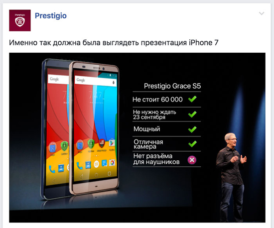 Не прошла мимо и белорусско-кипрско-китайская Prestigio, смело сравнив с iPhone 7 свой бюджетный смартфон Grace S5. В общем-то, автор этого коллажа был, вероятно, единственным человеком на планете, которому пришло в голову сравнить iPhone 7 с Grace S5.