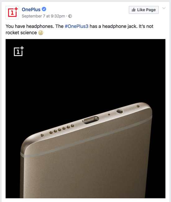 Как отмечает Ferra, китайский стартап OnePlus, нескромно специализирующийся на «убийцах флагманов», выложил на своей странице в Facebook фотографию нижнего торца смартфона OnePlus3 с комментарием: «У вас есть наушники. У OnePlus3 есть разъём для наушников. Ничего сложного».