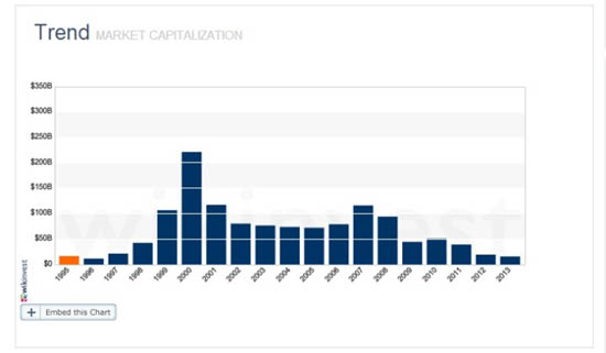 Так менялась капитализация Nokia с 1995 по 2013 год.