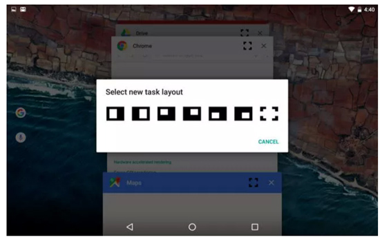 3. Откройте экран многозадачности долгим нажатием на кнопку домашней страницы (или на виртуальную кнопку). Вы увидите новый значок на миниатюрах страниц приложений. После нажатия на него система предложит выбрать расположение приложения: на половине, одной четвертой экрана или на всем экране. Когда открыто несколько приложений, пропорции их окон можно менять.