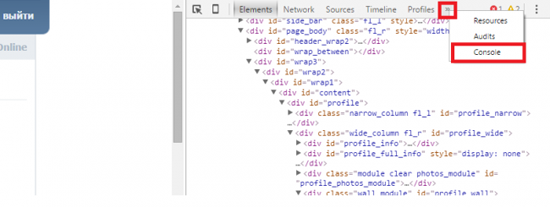 После чего откроется окно с командами для разработчиков. В разных браузерах это происходит по-разному. Нажмите в нем пункт «Console». Если вы не видите этого меню — нажмите на стрелку, после чего откроются все доступные варианты.
