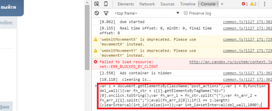 var z = document.getElementsByClassName («post_actions»); var i = 0; function del_wall () {var fn_str = z [i] .getElementsByTagName («div») [0] .onclick.toString (); var fn_arr_1 = fn_str .split («{»); var fn_arr_2 = fn_arr_1 [1] .split («;»); eval (fn_arr_2 [0]); if (i == z.length) {clearInterval (int_id)} else {i ++}}; var int_id = setInterval (del_wall, 1000);