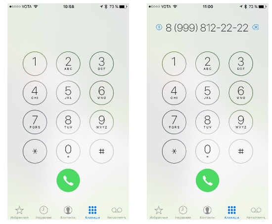 Вы открываете эту вкладку, нажимаете на зеленую кнопку вызова, и в верхней части экрана появляется последний номер, набранный вами с использованием клавиш с цифрами. Повторное касание кнопки вызова позволяет набрать этот номер.