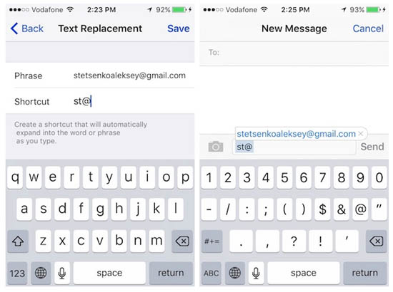 В первой строке нового окна необходимо ввести полную фразу, которую нужно заменить сокращением. Я очень жалею, что выбрал такой длинный адрес для почтового ящика, поэтому ввожу именно его. А в следующей строчке просто введи несколько символов, по вводу которых система будет предлагать замену.