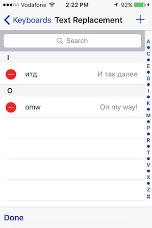 По умолчанию iOS выставляет некоторые сокращения сама. Для управления списком нажми на Правка в левом нижнем углу — так ты сможешь удалить уже существующие шаблоны. А чтобы добавить новый, клацни в правом верхнем углу на значок "+".