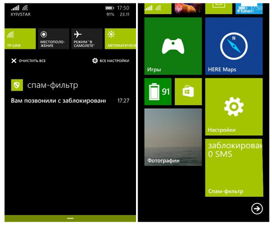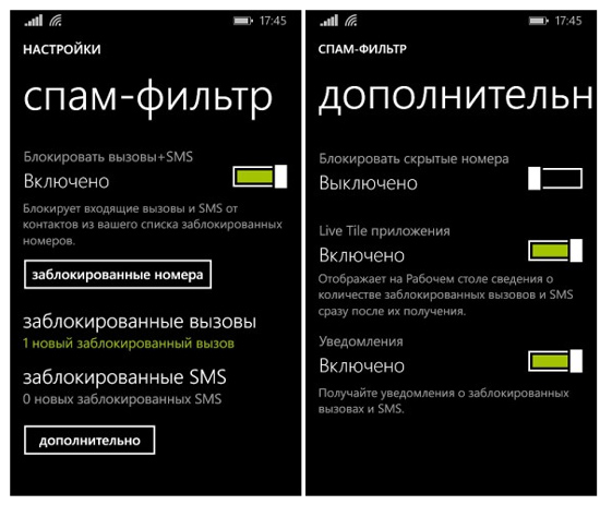 Обратите внимание на дополнительные опции фильтрации, которые скрываются под кнопкой “Дополнительно”. Они позволят вам получать информацию о новых звонках и сообщениях, которые поступают от заблокированных абонентов. Так, вы можете включить отображение уведомлений в “Центре уведомлений” Windows Phone 8.1, а также вывести на главный экран специальную плитку, отображающую количество срабатываний спам-фильтра.