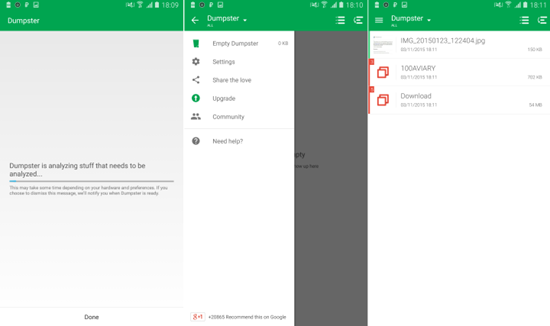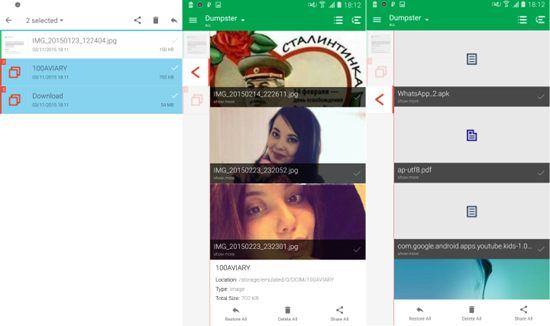 4. На главной странице Dumpster показано, какие файлы были удалены. При желании вы можете восстановить их, перенести в какое-либо другое место (например, в облачное хранилище) или уничтожить навсегда.