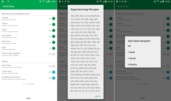2. Выберите, какие виды файлов после удаления будут переноситься на временное хранение в Dumpster и укажите, через какой промежуток времени они будут автоматически удаляться (никогда, неделя, месяц или три месяца). В дальнейшем выбор файлов и периодичность очистки корзины можно будет изменить в настройках приложения.