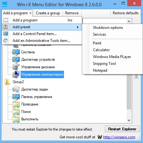 Для того, чтобы добавить новые команды, воспользуйтесь меню, которое расположено в верхней части окна программы. Здесь вы сможете добавить команду запуска любой программы, просто указав путь к исполнимому файлу. Ну а для добавления команд управления питанием есть готовый шаблон в меню Add Preset — Shutdown options. После этого вам останется только переименовать добавленные пункты и нажать кнопку Restart Explorer в правом нижнем углу программы.