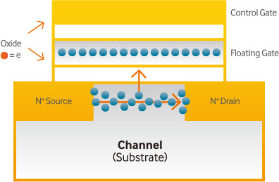 NAND — настоящее чудо современного рынка памяти. Она хранит информацию в массиве ячеек памяти — транзисторах с плавающим затвором. Программирование ячейки происходит следующим образом: на управляющий затвор NAND подается напряжение, после чего электроны начинают движение вверх. Затем они преодолевают границу из оксида и достигают плавающего затвора. Когда же вы удаляете какие-либо данные, подается напряжение, электроны начинают обратное движение от плавающего затвора через оксид с помощью заземления управляющего затвора.