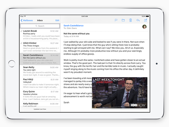 Третья составляющая многозадачности в iOS 9 - режим Картинка в картинке. С ним можно держать, например, FaceTime вызов или видео в маленьком окошке поверх приложения. Apple не уточнила, будет ли режим поддерживать YouTube и другие программы, но учитывая, что во время презентации Крэйг Федериги показывал работу функции на примере HBO Now, то надежда есть.