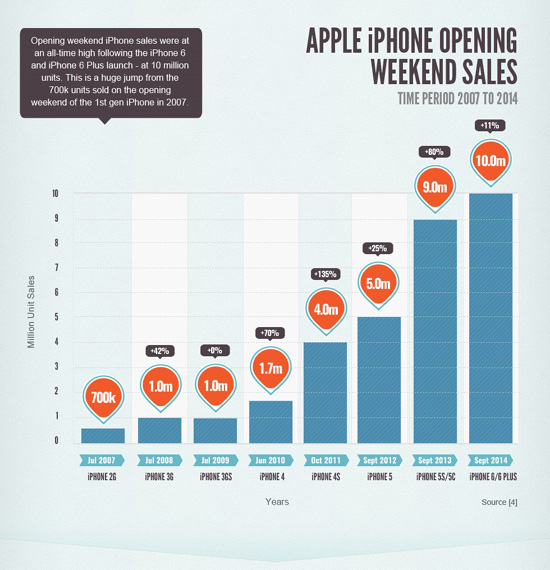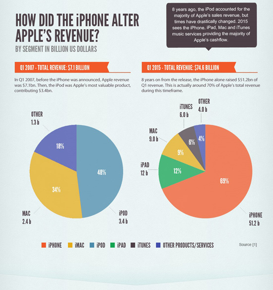 8 лет – столько времени прошло с тех пор, как первый iPhone поступил в продажу. Влияние этого устройства на современные смартфоны трудно переоценить, как и последствия данного анонса для Apple. На тот момент компания уже была на подъеме, но именно iPhone обеспечил Apple звание самого дорого предприятия за всю историю. Редакция GadgetValuer создала инфографику, в которой показано, как iPhone изменил Apple. Так, к примеру, в 2007 году основным источником прибыли компании были iPod (48%), а спустя 8 лет больше всего денег Apple приносят iPhone – 69%. На втором слайде показано, как изменились в цене акции компании спустя 12 месяцев после анонса iPad, iPhone, iPod и iMac. Как видите, на момент премьеры iPhone стоимость акций Apple составляла чуть больше $100. Уже через год этот показатель был удвоен. Что касается продаж, в 2007 году Apple продала лишь 1,39 млн устройств. Уже в следующем году этот показатель увеличился на 726% - до 11,63 млн, а в 2015 году общее количество проданных iPhone составило 169,22 млн гаджетов. На четвертом слайде изображены продажи каждого поколения iPhone в премьерные выходные.