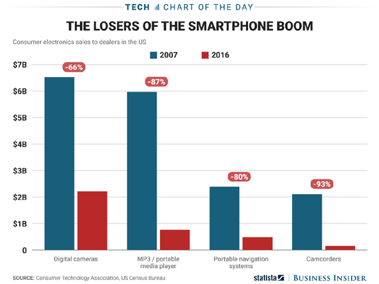 По данным консалтинговой компании Statista, больше всего от появления iPhone, как ни странно, пострадали портативные видеокамеры. Их доля на рынке сократилась аж на 93% в денежном выражении. MP3-плееры и автомобильные навигаторы пострадали на 87 и 80% соответственно, тогда как урон, нанесенный iPhone цифровым камерам, составил 66% от первоначальных продаж. Эти показатели соотносятся с действиями производителей.