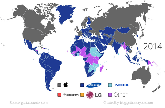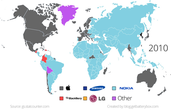 Так, например, в 2010 году почти во всем мире доминировала Nokia, а Apple пользовалась популярностью в США и Австралии, а также в Западной Европе. Samsung даже на горизонте видно не было.