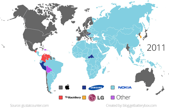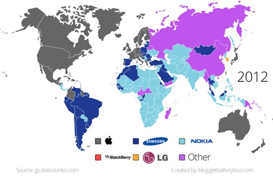 В 2012 году произошел бум «других» производителей — мелких китайских компаний, которые захватили Россию, Китай и часть Новой Зеландии. Samsung успела отхватить всю Южную Америку, пробралась в Азию и Европу. Nokia по-прежнему доминировала в Африке, а Apple довольствовалась Канадой, США и Австралией.