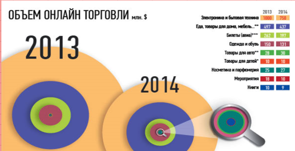 По данным совместного исследования Украинской ассоциации директ маркетинга (УАДМ), Ukraine Digital News и венчурного фонда AVentures Capital, общий объем e-commerce по итогам 2014 года в гривне вырос на 19%, в долларах упал на 20% - до $1,6 млрд (в расчет включены только B2C-продажи новых товаров).