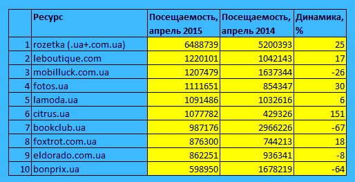 В список лидеров этого сегмента по итогам 2014 года вошли интернет-магазины, которые не были представлены в рейтинге-2013, - Lamoda и Stilago. Последний в 2015 году прекратил работу в Украине.