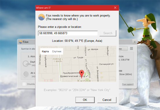2. Запустите f.lux и настройте программу, указав ваше местоположение. ZIP-код (он же индекс) вряд ли сработает (программа понимает только индексы американских городов), лучше укажите географические параметры долготы и широты. Их можно узнать на картах Google.
