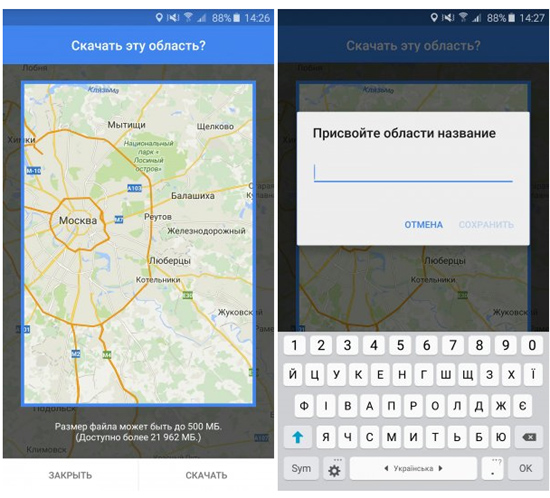 3.Теперь нажмите кнопку “+” внизу экрана, а затем программа попросит вас выбрать область, которую вы хотите использовать в офлайн режиме. После того, как вы сделаете это, нажмите “Скачать”. Также вам необходимо назвать выбранную область.