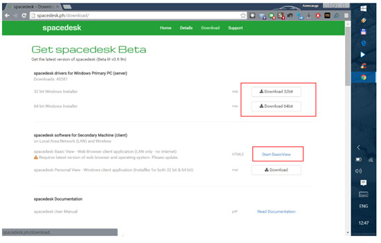 4. На смартфоне или планшете запустите браузер, зайдите на сайт SpaceDesk и в разделе «spacedesk software for Secondary Machine (client)» нажмите на ссылку «Start BasicView».