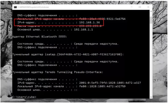 3. Откройте командную строку сочетанием клавиш Win+R, запустите терминал cmd и выполните команду ipconfig. Найдите адрес IPv4.