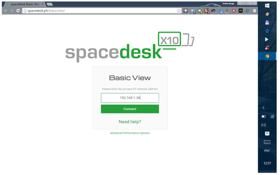 5. В открывшемся окне впишите адрес IPv4 своего основного компьютера и нажмите кнопку «Connect» — в браузере будет выведено изображение с компьютера.