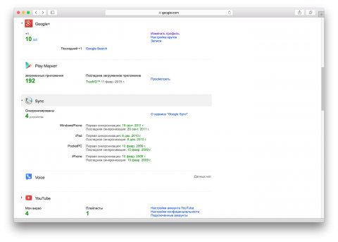 Следующие четыре раздела в информационном плане малоинтересны. В них можно настроить профиль Google+, узнать, сколько всего приложений вы загружали, какие устройства и когда синхронизировали.
