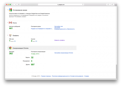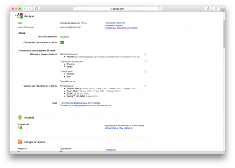 Начнём с аккаунта. Здесь вы можете узнать, услугами каких провайдеров пользовались в текущем месяце для доступа в Интернет, в каких браузерах и на каких операционных системах заходили в свой аккаунт, а также какие приложения или сервисы запрашивали доступ к вашей учётной записи. Однако пока не будем торопиться обвинять Google в сборе лишней информации: такие сведения важны, прежде всего, самому пользователю. Ведь благодаря им можно точно узнать, не входил ли в аккаунт посторонний человек, или не подписался ли случайно владелец на ненужный сервис. Периодическая проверка активности в своей учётной записи — хорошая привычка, поэтому в этом же разделе можно активировать функцию напоминаний о необходимости такой проверки в виде писем на почту.