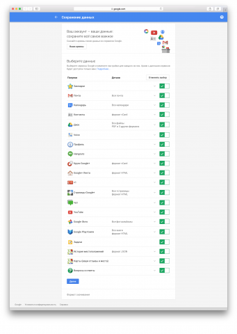 Если вас беспокоит такое внимание к своей персоне, и вы захотите удалить свой аккаунт — вполне вероятно, возникнет необходимость скачать все свои данные. По счастью, в Google предусмотрен и такой вариант — данные можно скачать разом, и из одного места.