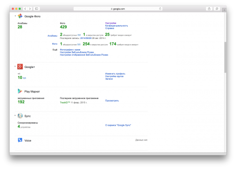 «Google Фото» — данный раздел посвящён фотографиям. Здесь можно узнать, сколько у вас альбомов, сколько в них фотографий, и какие фотографии из них общедоступны, а какие нет.
