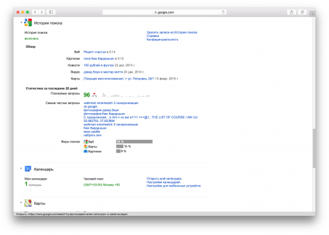 «История поиска» — из названия вкладки уже ясно, что именно находится: последний поисковый запрос, картинка, новость, видео или адрес на карте. Здесь же перечислены самые частые запросы и виды поиска. Интересующимся более подробными данными об истории своих поисковых запросов следует перейти сюда.
