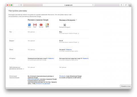 Кто же виноват, что Google знает о людях то, чем они, вероятно, не хотели бы делиться? Ответ прост — часть информации человек указывает в своём профиле, а поисковик умело использует полученные данные. Начнём с самого назойливого — с показа рекламы, на которую вы при правильном таргетировании наверняка обратите внимание.