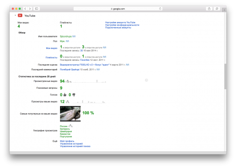 В данном разделе собрана информация о вашей активности в YouTube — сколько роликов за месяц посмотрели, сколько поставили оценок и прочее. Здесь же, при необходимости, можно настроить свой аккаунт.