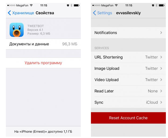 Не все приложения позволяют очищать кеш из настроек, но вы можете попробовать найти эту функцию в самом приложении. Вы можете увидеть в настройках, как много занимают временные файлы приложения Tweetbot, но избавиться от них вы можете только в настройках самого приложения.