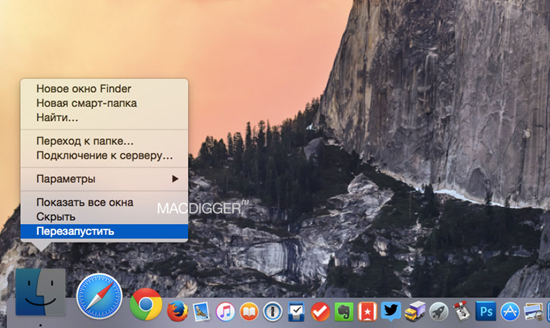Шаг 3: Теперь, удерживая на клавиатуре кнопку Option, сделайте правый клик мышкой на значке Finder в доке.